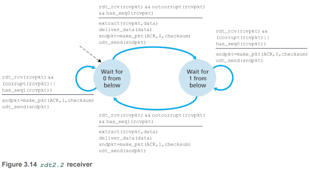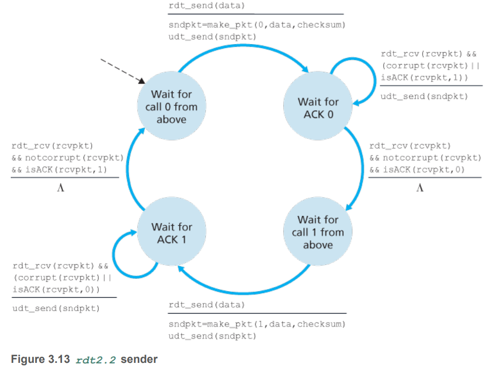 rdt2.1과 rdt2.2의 차이는 rdt2.2는 ACK만을 응답한다는 것이다. 수신자는 응답 ACK를 보낼 때 어떤 순서 번호에 대한 ACK인지를 같이 보내서 송신자에게 수신자가 올바르게 수신했는지를 알게 한다.