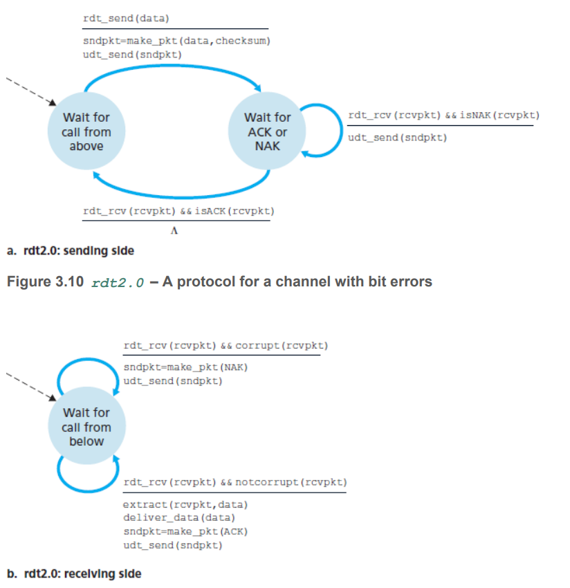 위의 rdt2.0의 FSM(유한 상태 머신)을 보면 송신 측은 상위 계층으로부터 메시지를 받으면 이를 보내고 수신 측으로부터 ACK나 NAK 응답을 기다린다. 그리고 응답으로 NAK를 받을 경우 다시 보내고 응답을 기다린다.