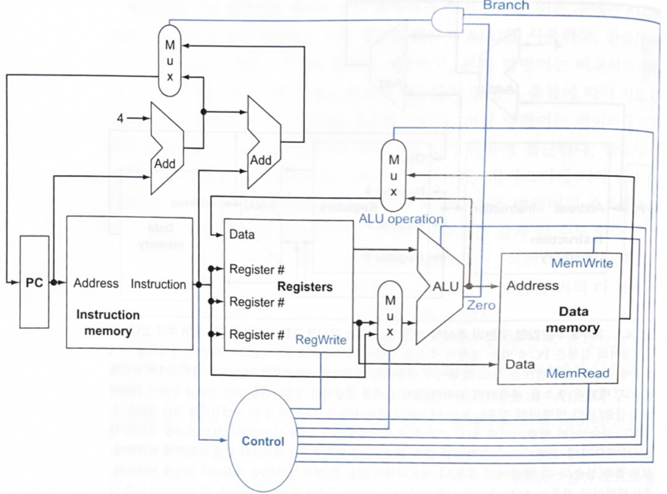 모든 명령어의 실행은 PC에 있는 명령어 주소를 명령어 메모리로 보내는 것으로 시작된다. 명령어를 가져온 후 명령어의 필드를 보고 명령어가 사용하는 레지스터 피연산자를 알아낸다. 레지스터 피연산자를 읽고, 각 명령어에 맞는 작업을 수행한다. - MIPS 부분집합의 기본적 구현 (멀티플렉서(Mux)와 제어유닛, 제어선 포함)