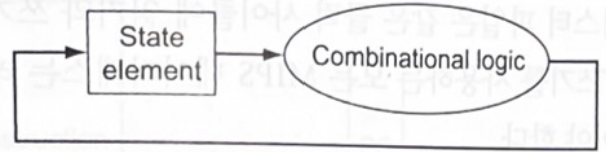 상태 소자만이 데이터 값을 저장할 수 있끼 때문에 모든 조합 논리는 상태 소자에서 입력을 받고 상태 소자로 출력을 내보낸다.조합 논리의 입력은 이전 클럭 사이클에서 상태 소자에 쓴 값이고, 출력은 다음 클럭 사이클에서 조합 논리나 상태 소자가 사용할 수 있는 값이다.