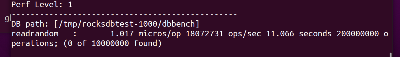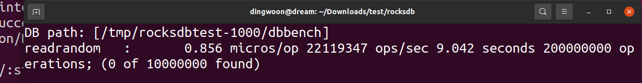 ./db_bench --benchmarks=readrandom --num=10000000 --threads=201000만 개의 랜덤 read 요청을 20개의 스레드를 통해 처리하는 벤치마크 테스트 코드입니다.